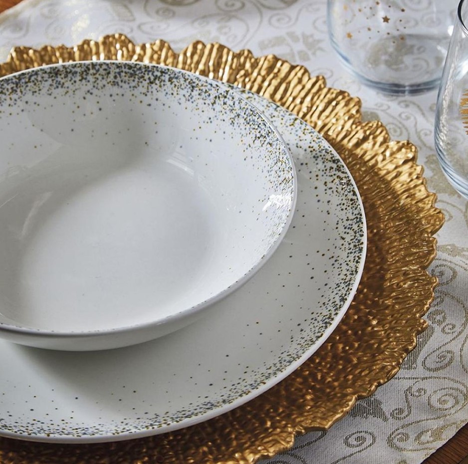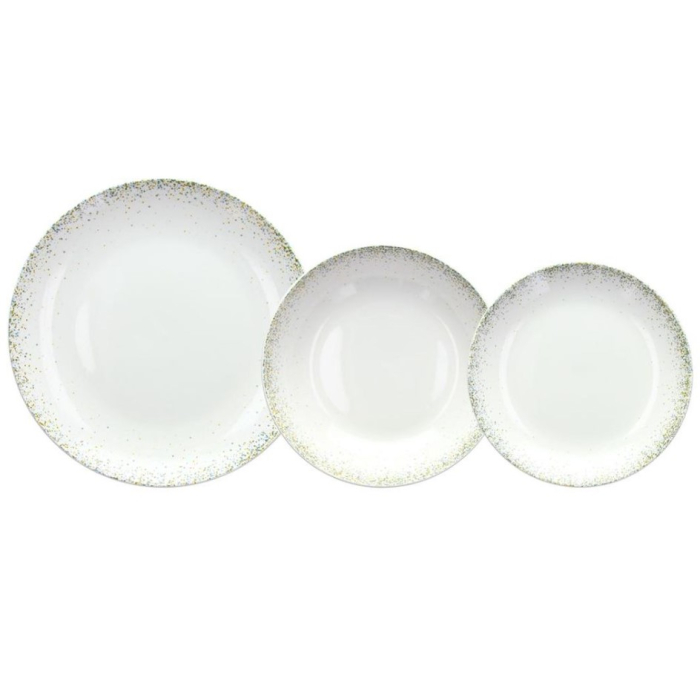 Set je napravljen je od bijelog New Bone China porculana, ukrašenog zlatno-plavom zvjezdanom prašinom, koja na stol unosi sofisticiranost, eleganciju i magiju. Set tanjira idealan je za svečane ručkove i večere.