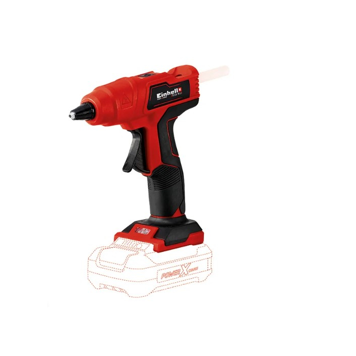 Einhell TE-CG 18 Li – Solo aku pištolj za vruće ljepilo član je Einhell Power X-Change porodice kojeg pokreće dugotrajna litijum-jonska punjiva baterija. Sve punjive baterije mogu se kombinovati s pištoljem za ljepilo. Ovaj priručni pištolj za ljepilo spreman je za upotrebu nakon zagrijavanja od samo 120 sekundi. Praktični LED zaslon prikazuje trenutačni toplotni status, a automatski se isključuje nakon 5 minuta bez upotrebe. Dodatna ravna mlaznica za ljepilo idealna je za specifične situacije. Za sigurno i ugodno rukovanje ima mekanu ručku. Uključeno je pet patrona ljepila. Ovaj proizvod dolazi bez baterije i punjača koji su dostupni zasebno, npr. kao PXC starter set.