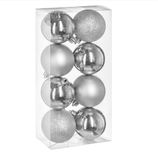 ATMOSPHERA srebrene kuglice za jelku, različitog sjaja, ukras je elegantan, savršeno kombinujući tradiciju i modernost. Njegov klasični oblik skladno će se uklopiti u svaku kompoziciju, dodajući note nostalgije i topline u svaki kutak Vašeg doma. Neka ovaj ukras postane centar pažnje na Vašem prazničnom drvcu.Materijal: PVCU setu dolazi osam kuglica.