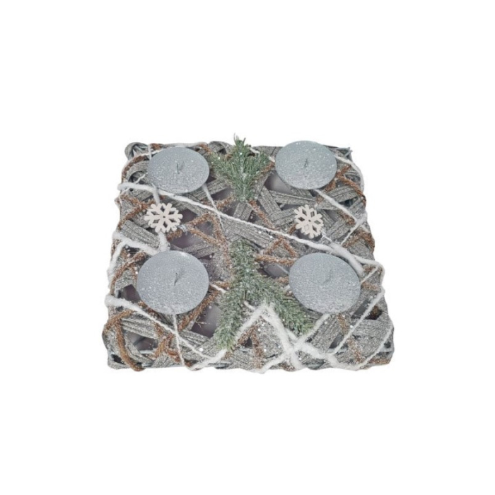 VIJENAC novogodišnji srebrni donijeće duh novogodišnjih praznika u Vaš dom. Predivni novogodišnji vijenac kvadratnog, modernog dizajna, izrađen od ukrasnog užeta, ukrasnih borovih grančica i dekorativnih snježnih pahuljica te posut srebrnim šljokicama. 4 držača za svijeće. Dimenzije: 30x30cm.