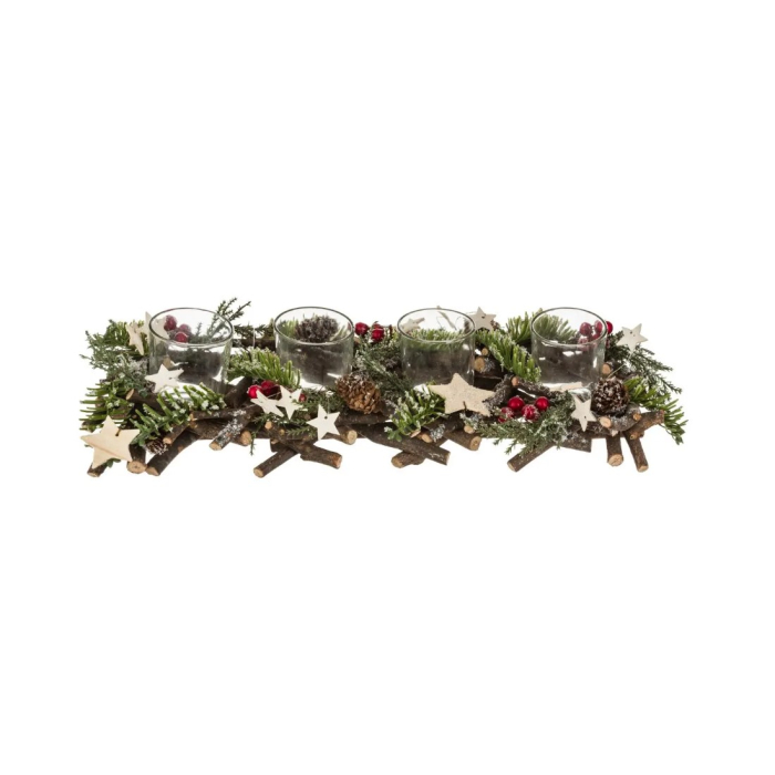 ATMOSPHERA novogodišnja dekoracija sa držačima za četiri lučice, ukras je elegantan, savršeno kombinujući tradiciju i modernost. Njegov klasični oblik skladno će se uklopiti u svaku kompoziciju, dodajući note nostalgije i topline u svaki kutak Vašeg doma. Neka ovaj ukras postane centar pažnje na Vašem prazničnom stolu, dodajući šarmantan sjaj i suptilno elegantan dodir.Materijal: drvoDimenzije proizvoda: 39 x 14 x 8 cmDimenzija stakla: 4,4 x 6,3 cm