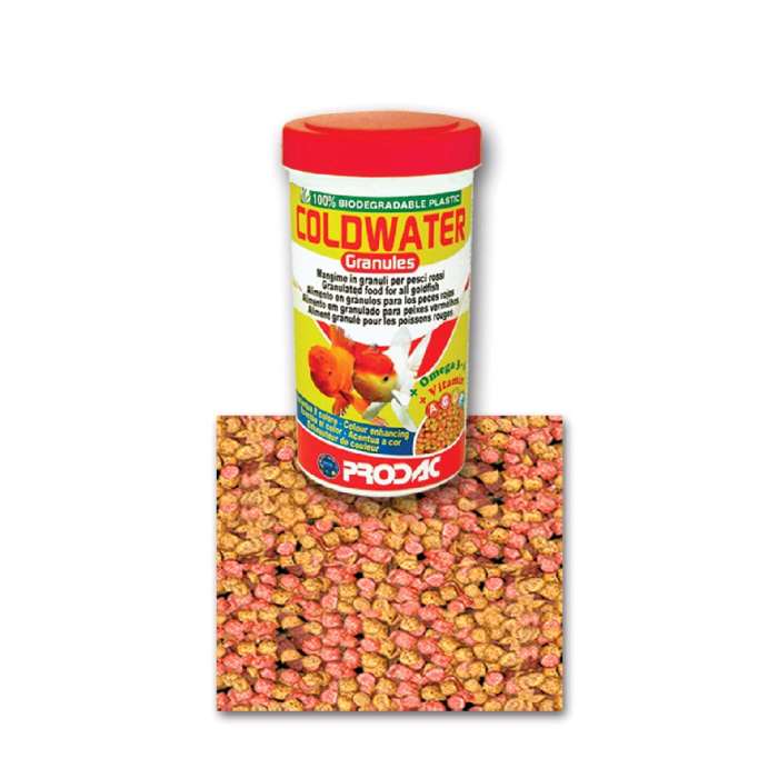PRODAC hrana za hladnovodne RIBICE 250mlpotpuna granulirana hrana za hladnovodne ribice i japanke srednje veličine. Hrana je obogaćena sastojcima koji pospješuju boju ribe i dodatke vitamina. Pakovanje je 250 ml.