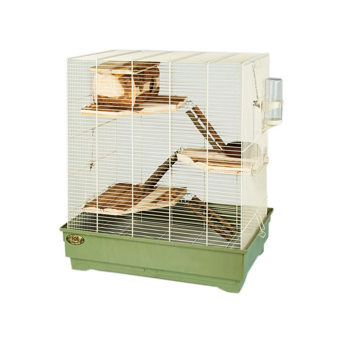 FOP kavez za glodare Fedro Natura je kavez za vjeverice, zečeve, zamorce i činčile sa odvojivim dnom od kvalitetnog PVC materijala sa tri drvene platforme, kućicom, posudom za hranu i pojilicom za vodu. Kavez je dimenzija 66x45 cm i visine 76 cm.
