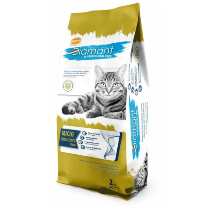 CENNAMO hrana za sterilisane mačke piletina Diamant 2 kg je specijalizovana hrana koja je formulisana za potrebe sterilizovanih mačaka. Sadrži visokokvalitetnu piletinu kao glavni izvor proteina, što pomaže u održavanju mišićne mase i energije. Ova hrana je obogaćena vlaknima, koja pomažu u kontroli telesne težine i poboljšavaju varenje, a takođe sadrži i omega-3 i omega-6 masne kiseline koje podržavaju zdravlje kože i dlake.