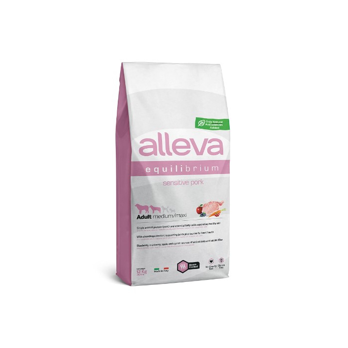 ALLEVA EQUILIBRIUM hrana za pse Adult Medium/Maxi je hrana za odrasle pse srednjih i velikih pasmina. Okus je svinjetina. Visokokvalitetna hrana. Pakovanje: 12kg. Alleva Equilibrium recepture sadrže veliku količinu Omega 3 za podršku koži, kao i glukozamin i kondroitin za podršku zglobovima.