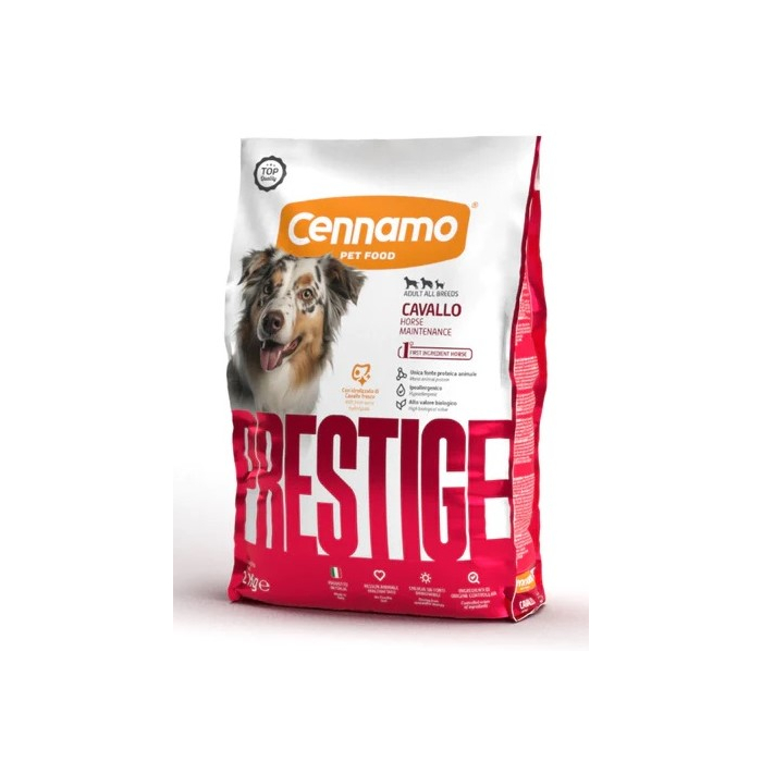 CENNAMO hrana za pse Prestige Adult konjetina 2 kg, potpuna i uravnotežena hrana visoke kvalitete za odrasle pse svih veličina. Formuliran s konjskim kao jedinim izvorom životinjskih proteina, stoga je vrlo ukusan i savršen za održavanje zdravlja psa.Dehidrirani životinjski proteini (piletina min. 20%), izvorna durum pšenica, kukuruz, riža, ulja i masti, rogači, F.O.S. (frukto-oligosaharidi), vitamini i minerali.