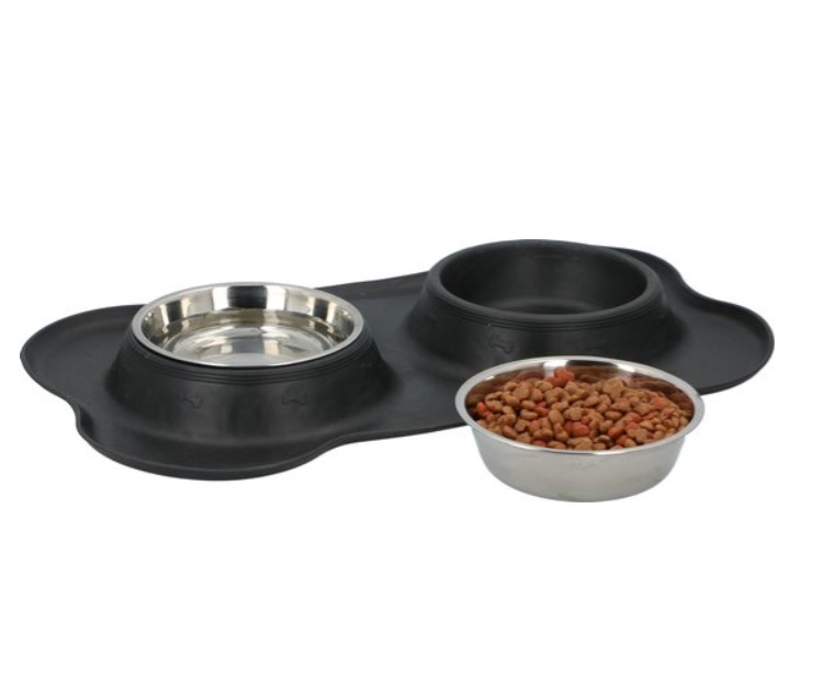 POSUDA za psa 2/1 u silikonskom držaču 46 x 27 x 4 cm, omogućite svom kućnom ljubimcu lak pristup hrani, vodi ili i jednom i drugom uz ovu dvostruku zdjelu za hranjenje i set prostirki. Izrađene od nehrđajućeg čelika su ove dvostruke zdjelice za pse s mekom i fleksibilnom neklizajućom crnom silikonskom podlogom u obliku kosti, kako bi vašim kućnim ljubimcima pružile sigurno mjesto za hranjenje, bez prolijevanja hrane, klizanja zdjelica i grebanja poda.