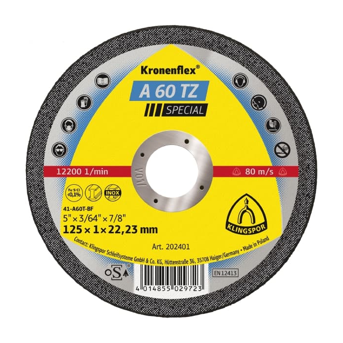 KLINGSPOR ploča rezna 115x1x22- A 60 TZ je odlična rezna ploča napravljena od kvalitetnih materijala sa brzo i sugurno rezanje zahvaljujući čvrstom tijelu.