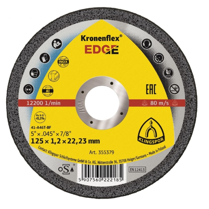 KLINGSPOR rezne ploče EDGE 125x1.2x22.23 mm je odlična rezna ploča napravljena od kvalitetnih materijala sa brzo i sugurno rezanje zahvaljujući čvrstom tijelu.