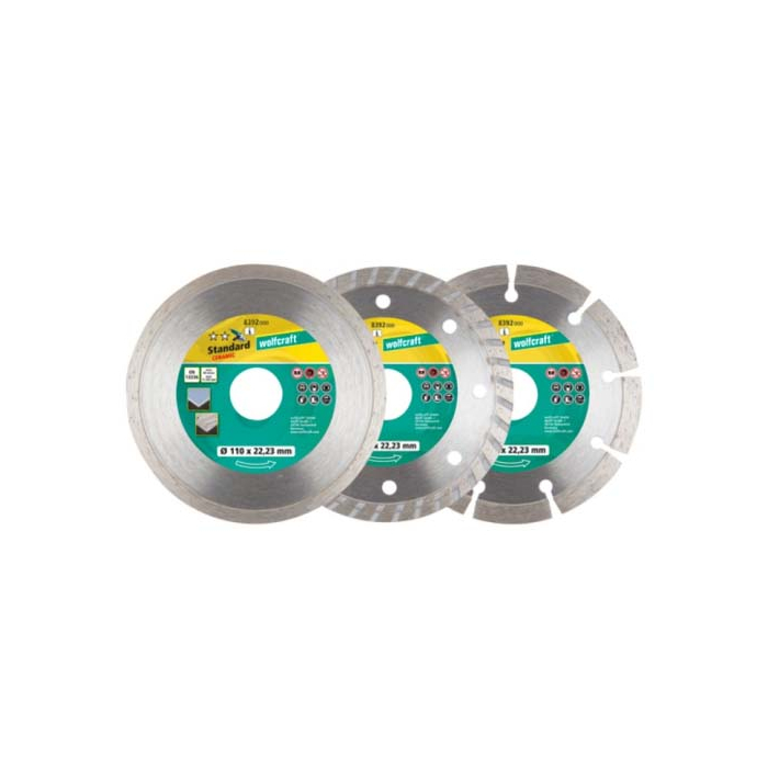 WOLFCRAFT rezne ploče dijamantske dolaze u setu od 3 diska.Disk za pločice: za glatke čiste rezove u mermeru, pločicama i keramičkim pločicama.Univerzalni disk: za rezanje cigle, prirodnog kamena i kamenih ploča.Turbo disk: za sve radove u betonu, armiranom betonu i granitu.