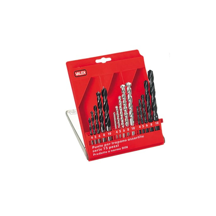 VALEX burgije set za drvo, metal, beton 15 komada, komplet sastavljen od 15 različitih vrhova varijabilne dužine od 75 do 130mm u zavisnosti od veličine.Sastavljeno od: 5 HSS svrdla za metal O 4-5-6-8-10mm5 burgija za drvo O 4-5-6-8-10mm bušilica za zid O 4-5-6-8-10mm sa tvrdom metalnom pločom