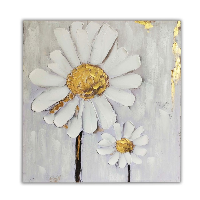 SLIKA cvijet Margarite sa zlatnim detaljima sa 80% ručnog rada prikazuje motive margarita sa naglašenim zlatnim detaljima i izraženom reljefnom teksturom. Kombinacija bijelih latica i zlatnih akcenata stvara elegantan i luksuzan vizuelni efekat. Idealna je za dnevni boravak, spavaću sobu ili moderan enterijer gdje unosi svježinu, toplinu i upečatljiv dekorativni akcenat.Dimenzije: 100x100cm