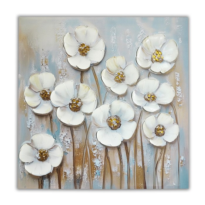 SLIKA cvjetna harmonija u zlatnim tonovima sa 50% ručnog rada prikazuje nježne bijele cvjetove sa zlatnim središtem i izraženom reljefnom teksturom. Kombinacija svijetlih tonova sa toplim zlatnim i suptilnim plavim nijansama stvara elegantan i moderan ambijent. Idealan je izbor za dnevni boravak, spavaću sobu ili savremeni enterijer gdje unosi svježinu i dekorativnu notu luksuza.Dimenzije: 100x100cm