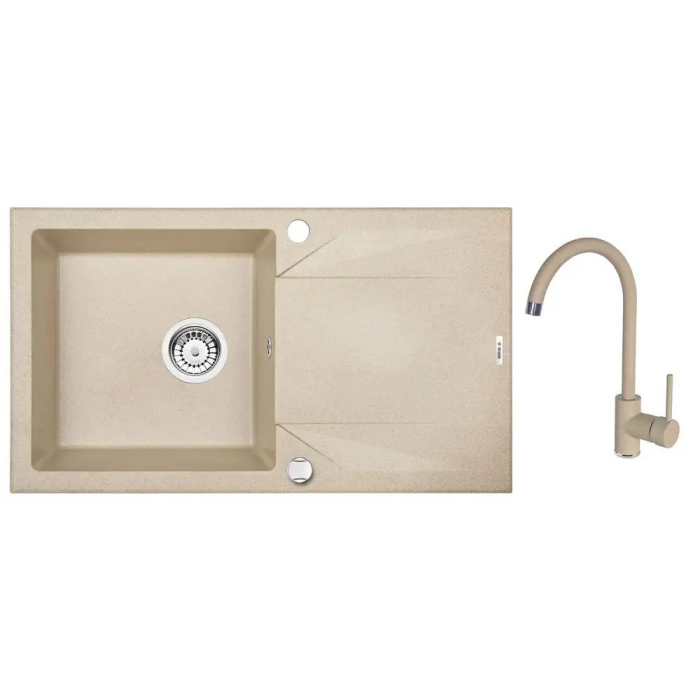 DEANTE granitni sudoper Evora sa baterijom izvrstan je kuhinjski set (komplet). Moćni granitni sudoper omogućava odlaganje vrućih posuda čak do temperature od 250 °C. Specijalni premaz sprječava nastajanje ogrebotina. Dimenzija sudopera (DxŠxD): 78 x 49 x 19cm. Visina baterije: 35,5cm. Boja pijeska.