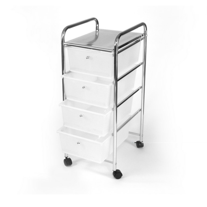 AWD INTERIOR polica za kupatilo sa ladicama 33 x 80,5 x 39 cm, na točkovima sa 4 praktične ladice za odlaganje stvari. Bijele fioke su izrađene od plastike. Za izradu okvira korišten je hromirani čelik. Stalak na točkovima biće savršen u svakom kupatilu, garderobi, kozmetičkom salonu ili frizeru.Dimenzije: 33 x 80,5 x 39 cmMaterijal: Hromirani čelik i plastika