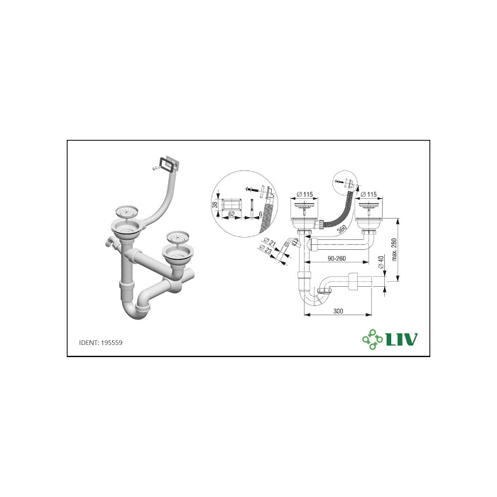 LIV sifon dvodjelni sudoper+kada sa priključkom - od dugotrajne plastike, jednostavna montaža.Za sve uobičajene sudopere sa dodatkom za kadu.
