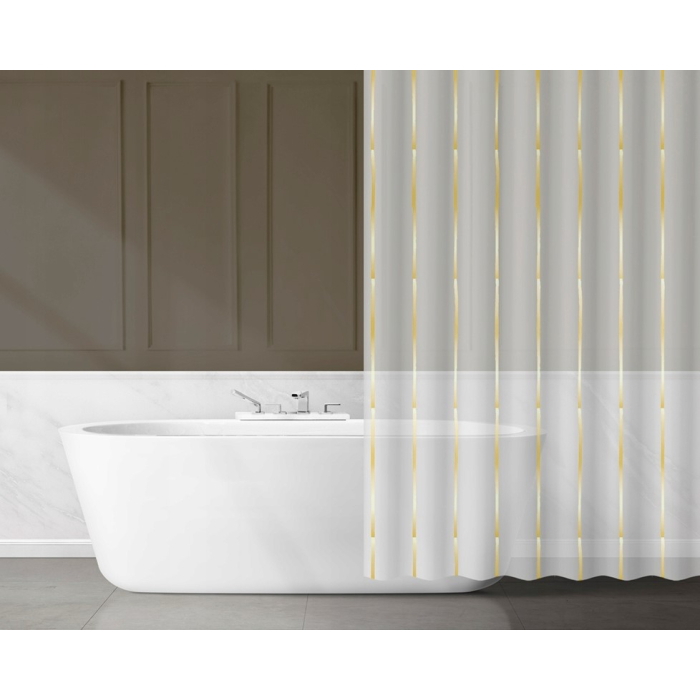 AWD INTERIOR zavjesa za kadu Eva sa zlatnim nitnama 180 x 180 cm, savršeno za kupatila u glamuroznom, boho i retro stilu. Prozirna zavjesa preporučuje se u kupatilima u kojima prostor za kupanje nije osvijetljen i ne želimo zaklanjati svjetlo. Set uključuje 12 bijelih prstenova za montažu na koje se može objesiti na šipku za tuširanje. Zavjesa za tuš je vodootporna i lako se čisti.Dimenzije: 180 x 180 cmBoja: Bijela sa zlatnim