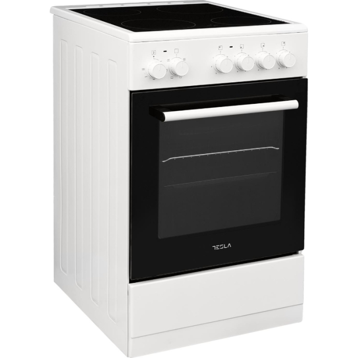 TESLA šporet električni CV5400SW sa staklokeramičkom pločom sa koje se lako skidaju mrlje. Sa velikom rernom smještenim ventilatorom, grijačima sa gornje i donje strane i sijalicom imaće te uvijek pečenu hranu baš kako želite. Lako čišćenje rerne pomoću vodene pare.