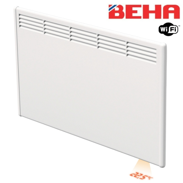 BEHA konvektor 1500W sa elektronskim termostatom sa funkcijom daljinskog upravljanja putem interneta, uz prikaz i trenutne temperature na mobilnom telefonu. IP24 zaštita. Predviđen za prostorije do 15 m2. Dimenzije: 1175x400x83 mm (ŠxVxD).