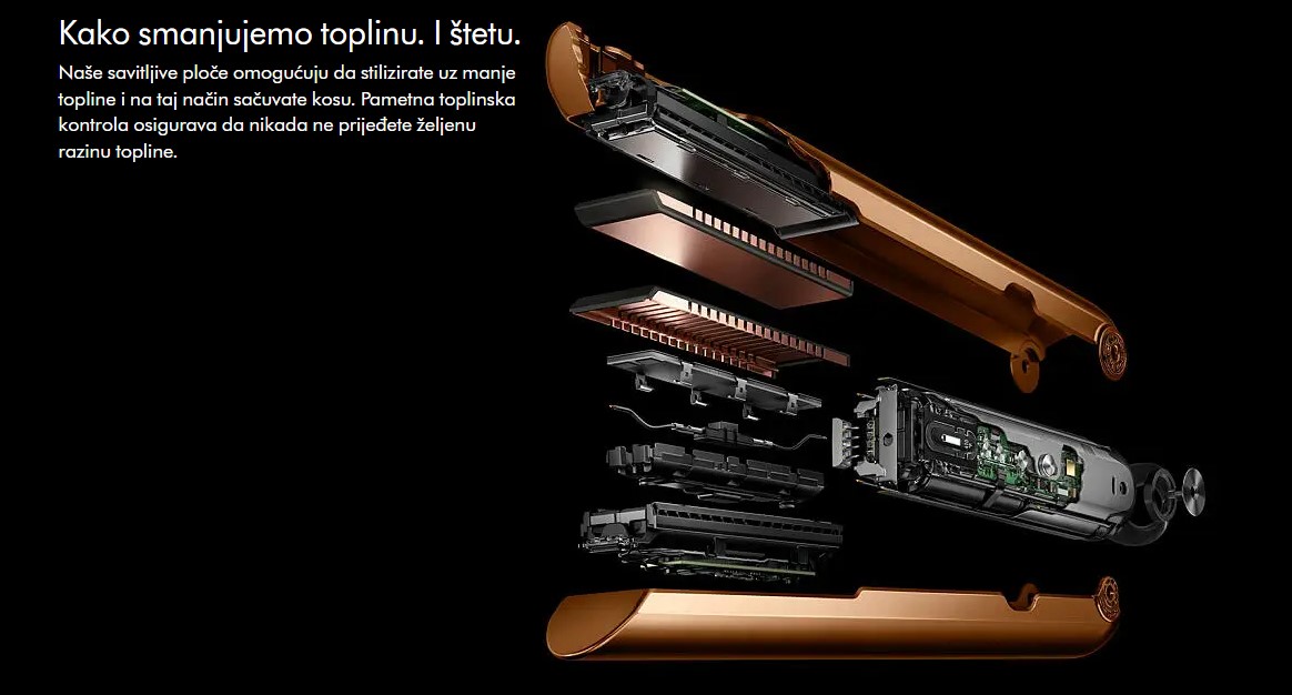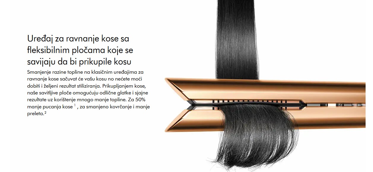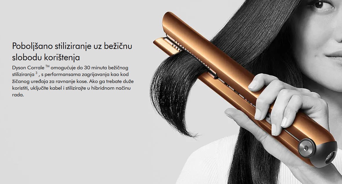DYSON pegla za kosu Corrale Bright Copper/Bright je bežična pegla za kosu koja pruža profesionalne rezultate bez kompromisa. Zahvaljujući savitljivim pločama od legure mangana i bakra, ravna kosu uz manje toplote i smanjuje oštećenja do 50%. Radi do 30 minuta bez kabla ili neograničeno uz priključak. Brzo se puni do 90% za samo 40 minuta. Nudi tri nivoa temperature (165°C, 185°C, 210°C) i inteligentnu kontrolu toplote za optimalnu zaštitu i oblikovanje svih tipova kose.