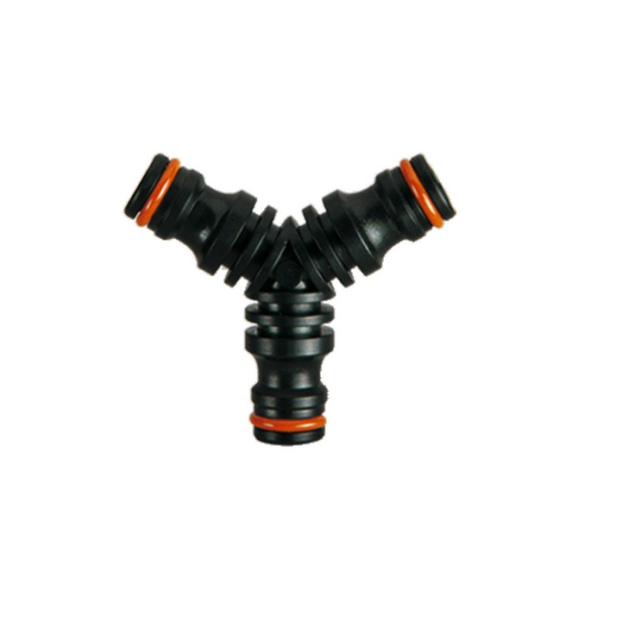CLABER priključak trokraki 8614 služi za razdvajanje linije za navodnjavanje i odvoda vode na dvije različite strane. Komadi cijevi na krajevima su povezani automatskim nastavcima.