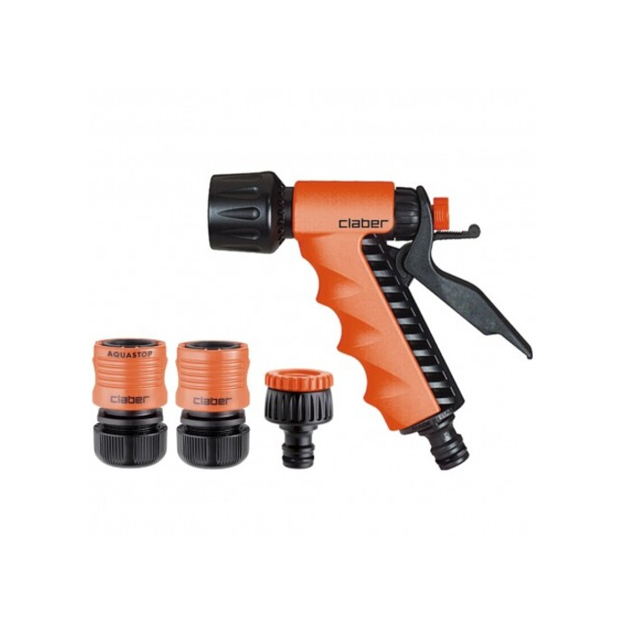 CLABER set za crijevo 1/2" sve što vam je potrebno za učinkovito i udobno zalijevanje vrta. Set uključuje ergonomski dizajniran, robustan, podesiv pištolj za prskanje Ergo, 3/4" priključak za slavinu (s reduktorom na 1/2" može se lako ugraditi bez alata) i dvije brze spojnice za spajanje pištolja.