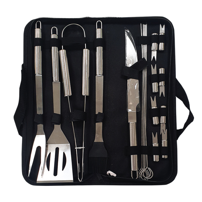 PRIBOR za roštilj BBQ-02 je izrađen od visokokvalitetnog nehrđajućeg čelika i ergonomski je oblikovan, što znatno olakšava čišćenje. Osim toga, svi alati se mogu objesiti na kuku za jednsotavno i lagano odlaganje.