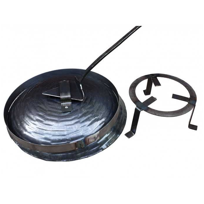 SAČ komplet 55cm sadrži ručno kovani poklopac, , tronožac, lopatica i prsten za žar. Delikatesi od pečenja zavode vas karakterističnim ukusom i mirisom, jer se hrana i začini mešaju u tepsiji tokom pečenja, a sve tečnosti i mirisi se čuvaju. Tepsija nije uključena u komplet.