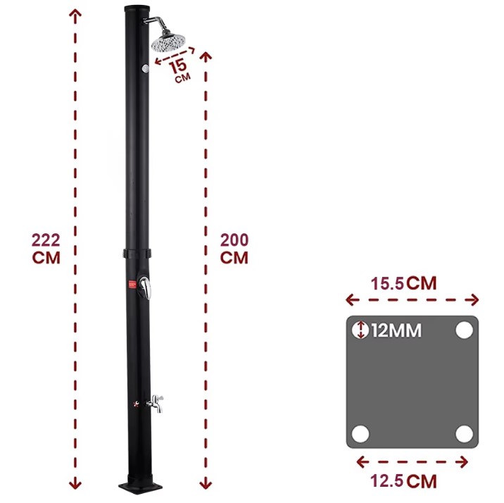 STRONGPRO tuš solarni KR-301 20L- Savršen spoj funkcionalnosti i elegancije!Solarni tuš kapaciteta 20 litara omogućava Vam uživanje u toploj vodi bez dodatnih troškova energije. Zahvaljujući solarnom sistemu grijanja, voda se prirodno zagrijava sunčevim zracima, pružajući Vam ugodno osvježenje u dvorištu, pored bazena ili na vikendici. Moderan dizajn i kvalitetni materijali osiguravaju dugotrajnost i otpornost na vremenske uslove.Dimenzije (š x v x d): 15,5x222x15,5cm