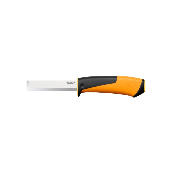FISKARS nož sa oštračem je nož sa oštračem u futroli te se nož oštri svaki put pri vađenju. Sječivo sa tesarskim vrhom.