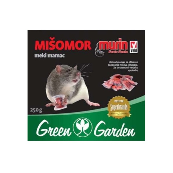 GREEN GARDEN mišomor meki mamac 250g je gotovi meki mamac za efikasno suzbijanje miševa i štakora. Za unutrašnju i vanjsku upotrebu.
