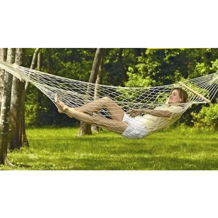 LJULJAŠKA viseća mreža 266x80cm je napravljena od pamučnih vlakana koja su isprepletena i drže ih drvene letvice. Lako se kači između dva drveta i prilagodljiva je svakoj vrsti okruženja.