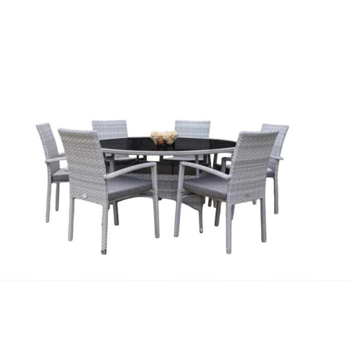 DECOSTRONG vrtni set Bahamas sa 6 stolica donosi eleganciju i udobnost u vašu baštu, terasu ili dvorište. Set se sastoji od velikog okruglog stola (prečnik 150 cm, visina 73 cm) sa crnim kaljenim staklom debljine 5 mm i šest udobnih stolica (62x56x91 cm). Konstrukcija je izrađena od aluminijuma sa zaštitnim premazom, ispletena sivim PE ratanom, dok su jastuci izrađeni od kvalitetne poliesterske tkanine (220 g/m2). Idealno za okupljanja i uživanje na otvorenom.