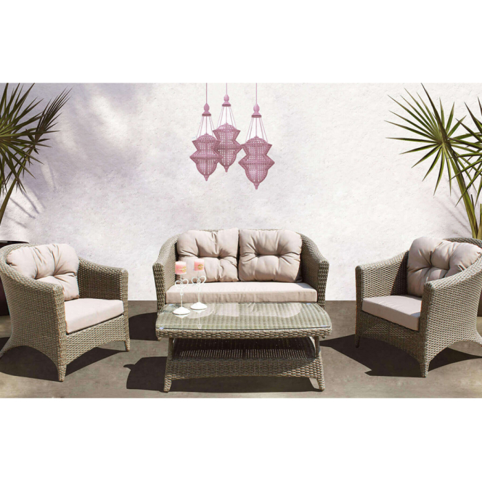 GARNITURA vrtna Cosma Kansas NCLA sastoji se od dvosjeda, dvije fotelje i stolića za kafu sa staklenom pločom. Ovaj vrtni set idealan je za uživanje na otvorenom, vrlo glamurozan te savršeno uklopiv u svaki vrt. Sofa je dimenzija 140 x 80 x h81 cm, fotelja 82 x 80 x h81 cm i sto 111 x 66 x h40 cm.