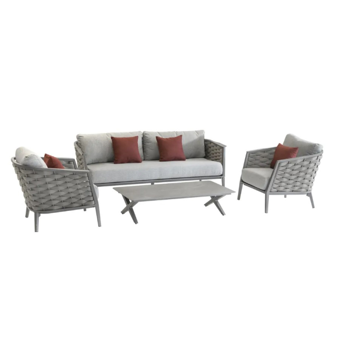 HESPERIDÉ garnitura Preline 5 sjednih mjesta Alu 87x79x198cm, sadrži sto za kafu, sofa za do tri osobe i dve fotelje.Aluminijski okvir je napravljen od atraktivne akrilne pletenice, koja cijelom setu istovremeno daje elegantan izgled. Udobno sjedenje u poliesterskim jastucima koji su ugodni na dodir.Dimenzije stola: 124 x 65 x 33 cmDimenzije klupe: 195 x 67 x 78 cmDimenzije fotelje: 77 x 67 x 78 cmNosivost: 110 kgBoja: Svijetlo sivaMaterijal: Poliester, aluminijum, akril
