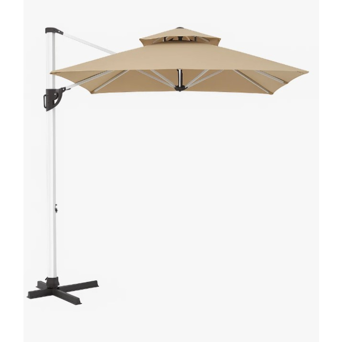 DECOSTRONG suncobran Premium Roma je luksuzan suncobran idealan za veće terase, dvorišta i ugostiteljske prostore. Dimenzija 300x300x270 cm, sa čvrstom aluminijumskom konstrukcijom, sivim premazom i 360° rotirajućom funkcijom. Otvara se pomoću ručice (crank system), a platno od poliestera (200 g/m2) pruža odličnu zaštitu od sunca. Uključuje ukrštenu bazu, ali bez tegova. Modernog dizajna i visokog kvaliteta, prilagođen za svakodnevnu upotrebu na otvorenom.