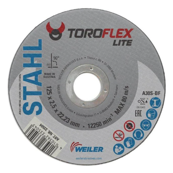 WEILER 23 ploča rezna 125x2,5x22,23 F41 Toro Lite namijenjena je za rezanje metala i čelika pomoću ugaonih brusilica. Prečnik 125 mm, debljina 2,5 mm i standardni prihvat 22,23 mm omogućavaju kompatibilnost sa većinom alata. Izrađena je od kvalitetnog abrazivnog materijala (korund) za precizne i čiste rezove uz dug vijek trajanja. Tip F41 označava ravnu ploču pogodnu za stabilno i sigurno rezanje.